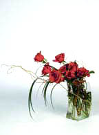 A curvy glass vase makes a sweeping gesture with bunches of lily grass arching beyond the roses, while curly willow acts as support and offers contrast.