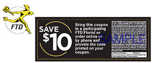 We honor all FTD® coupons and Teleflora® coupons redeemable at FTD and Teleflora florists, including $5 Off and $10 Off coupons appearing in newspapers and magazines nationwide prior to Christmas, Valentine's, Mother's Day, and other floral holidays. For in-store purchases, simply present your coupon. When ordering by phone, provide your coupon code when you call, and our floral consultants will be happy to apply your discount to any qualifying purchase. When ordering online, note the coupon brand and coupon code in the Special Instructions field of our order form, and we will apply an adjustment for any qualifying purchase after your order is received. Example: