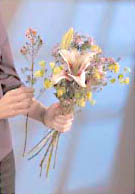 Use a crisscross motion to create your bouquet. Build the bouquet as follows: Begin with one stem of Stargazer lily. Then, add tow stems of phlox, one on each side of the lily. Next, add two stems of bupleurum between each stem of phlox. Then evenly add four stems of waxflower.