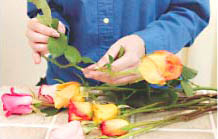 Using a sharp knife or scissors, cut 1 inch off the bottom of one stem and put immediately in water. A rose stem is like a drinking straw; water will flow up the stem in 2 seconds. If you don't put the stem in water immediately, air will block the water from going up the stem. Continue cutting one stem at a time and put in water.