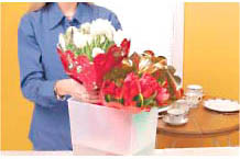If a few tulip heads droop, perk them up by poking a hole just beneath the flower head with a pin to allow air to escape and water to move up the stem. Remove damaged leaves and stems. Place in vase. For longest life, remove the flowers, wash the vase, recut the stems and add them to the vase with fress water and floral food.